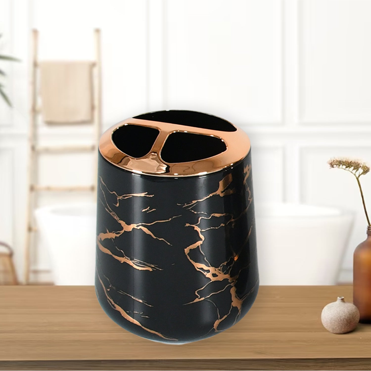 - Black tumbler has a matte finish and an abstract gold patterned surface, making it ideal for bringing a monochromatic balance to vibrant corners.