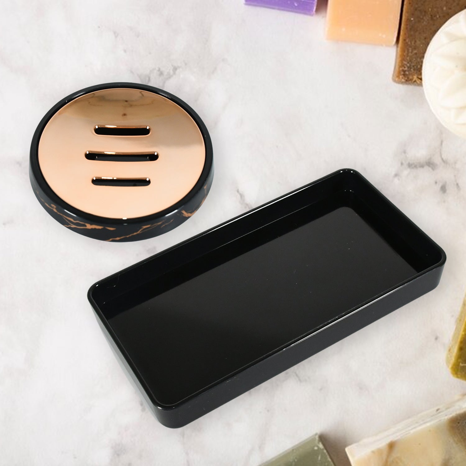 - This bathroom accessory set is made of Hard Plastic and has a sleek matte finish, making it a modern and functional addition to your home. A matching tumbler and soap dispenser are included in the Five -piece set.